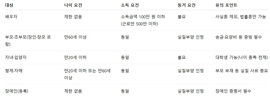 관계·나이·소득·실질부양·증빙까지 한 번에 맞추면, 다른 공제(교육비·의료비·기부금 등)도 자연스럽게 최적화됩니다.