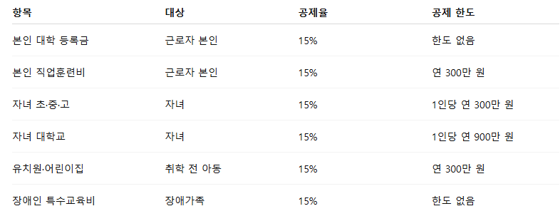 특히 내일배움카드 직업훈련비도 공제 대상이므로 직장인 재교육에 유리합니다.