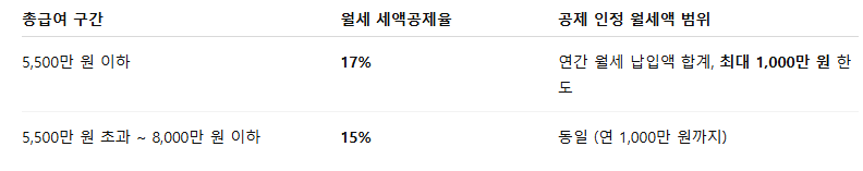 즉, 월세가 많을수록 세액공제 혜택도 커지지만, 공제 한도 1,000만 원을 넘어서는 금액은 공제되지 않는 것을 기억해야 합니다.